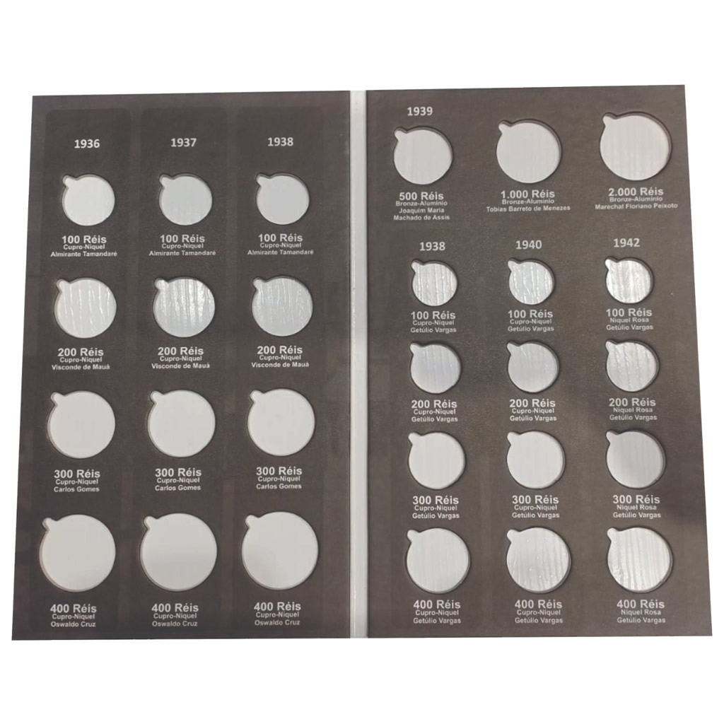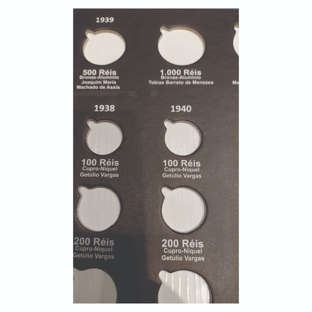 Descrição: Álbum para moedas dos Ilustres. Possui espaço para as moedas de 100, 200, 300, 400, 500, 1000 e 2000 réis que homenagearam alguns personagens ilustres do nosso país 100 réis 1938 1940 1942 200 réis 1938 1940 1942 300 réis 1938 1940 1942 400 réis 1938 1940 1942 100 réis 1936 1937 1938 200 réis 1936 1937 1938 300 réis 1936 1937 1938 400 réis 1936 1937 1938 500, 1.000 e 2.000 réis 1939 Medidas: 125x205mm Peso 79g Álbum produzido em papelão. Possui as furações com encaixe perfeito para suas moedas.
